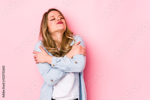 Young caucasian woman isolated on pink background hugs, smiling carefree and happy.