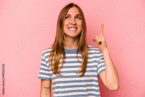 Young caucasian woman isolated on pink background indicates with both fore fingers up showing a blank space.