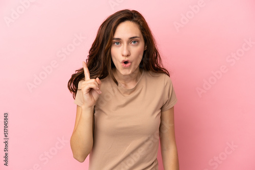 Young caucasian woman isolated on pink background intending to realizes the solution while lifting a finger up