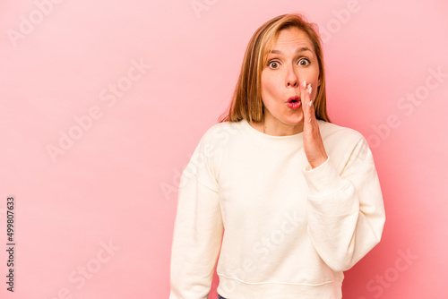 Young caucasian woman isolated on pink background is saying a secret hot braking news and looking aside