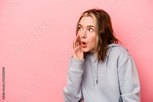 Young caucasian woman isolated on pink background is saying a secret hot braking news and looking aside