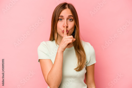 Young caucasian woman isolated on pink background keeping a secret or asking for silence.