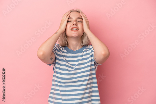 Young caucasian woman isolated on pink background laughs joyfully keeping hands on head. Happiness concept.