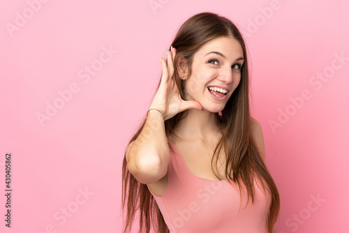 Young caucasian woman isolated on pink background listening to something by putting hand on the ear