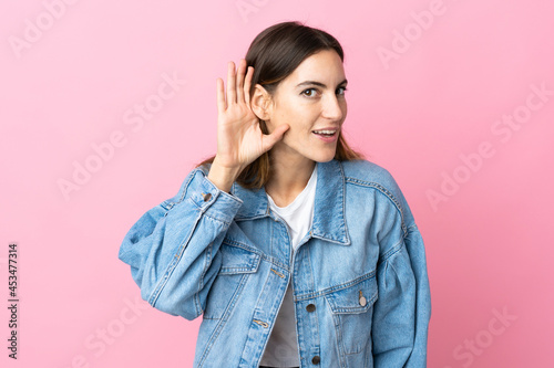 Young caucasian woman isolated on pink background listening to something by putting hand on the ear