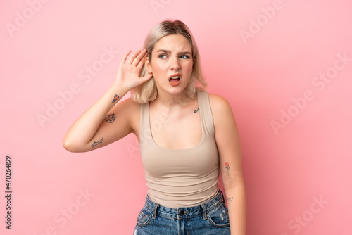 Young caucasian woman isolated on pink background listening to something by putting hand on the ear