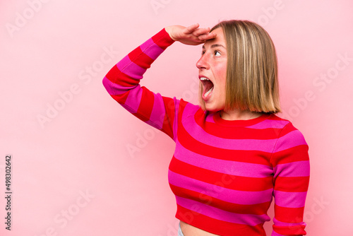 Young caucasian woman isolated on pink background looking far away keeping hand on forehead.