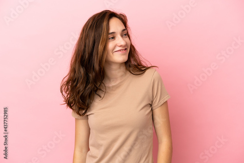 Young caucasian woman isolated on pink background looking to the side and smiling