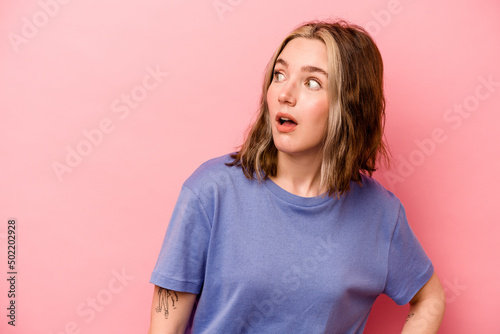Young caucasian woman isolated on pink background looks aside smiling, cheerful and pleasant.