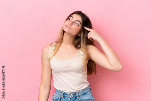 Young caucasian woman isolated on pink background making the gesture of madness putting finger on the head
