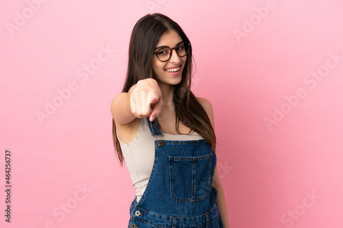 Young caucasian woman isolated on pink background pointing front with happy expression
