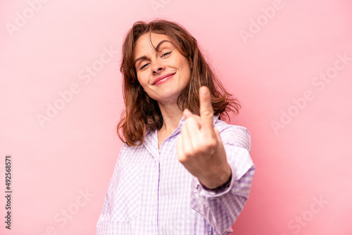 Young caucasian woman isolated on pink background pointing with finger at you as if inviting come closer.