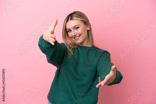 Young caucasian woman isolated on pink background presenting and inviting to come with hand