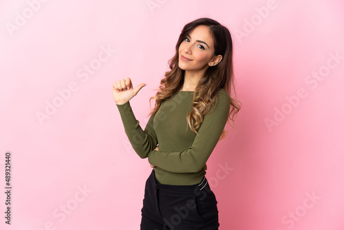Young caucasian woman isolated on pink background proud and self-satisfied