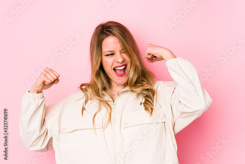 Young caucasian woman isolated on pink background raising fist after a victory, winner concept.