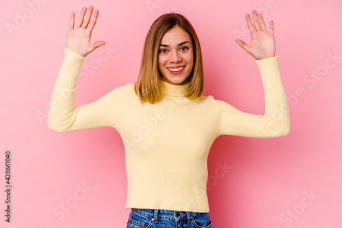 Young caucasian woman isolated on pink background receiving a pleasant surprise, excited and raising hands.
