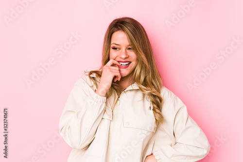 Young caucasian woman isolated on pink background relaxed thinking about something looking at a copy space.