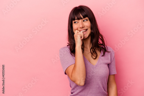Young caucasian woman isolated on pink background relaxed thinking about something looking at a copy space.