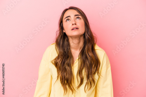 Young caucasian woman isolated on pink background shouting very angry, rage concept, frustrated.