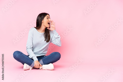 Young caucasian woman isolated on pink background shouting with mouth wide open to the lateral
