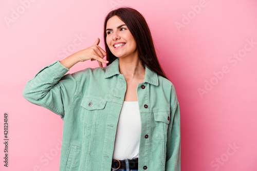 Young caucasian woman isolated on pink background showing a mobile phone call gesture with fingers.