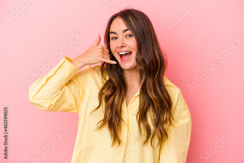 Young caucasian woman isolated on pink background showing a mobile phone call gesture with fingers.