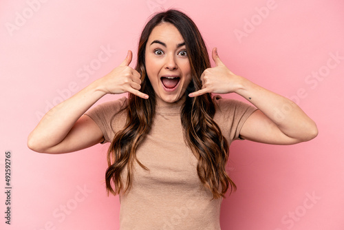 Young caucasian woman isolated on pink background showing a mobile phone call gesture with fingers.