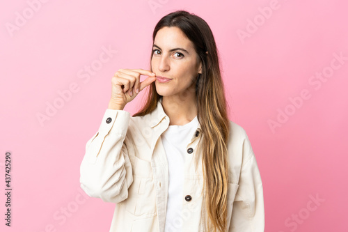 Young caucasian woman isolated on pink background showing a sign of silence gesture