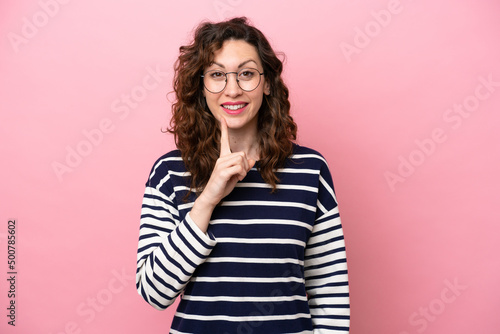 Young caucasian woman isolated on pink background showing a sign of silence gesture putting finger in mouth