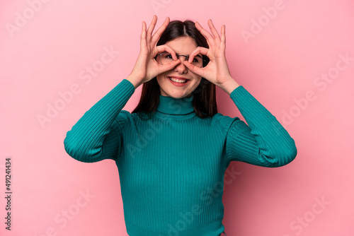 Young caucasian woman isolated on pink background showing okay sign over eyes