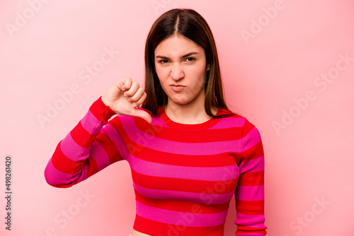Young caucasian woman isolated on pink background showing thumb down, disappointment concept.