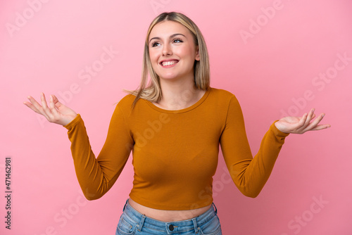 Young caucasian woman isolated on pink background smiling a lot