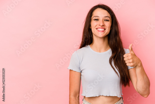 Young caucasian woman isolated on pink background smiling and raising thumb up