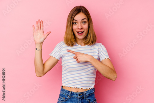 Young caucasian woman isolated on pink background smiling cheerful showing number five with fingers.