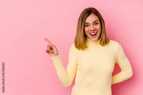 Young caucasian woman isolated on pink background smiling cheerfully pointing with forefinger away.