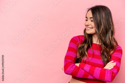 Young caucasian woman isolated on pink background smiling confident with crossed arms.