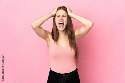 Young caucasian woman isolated on pink background stressed overwhelmed