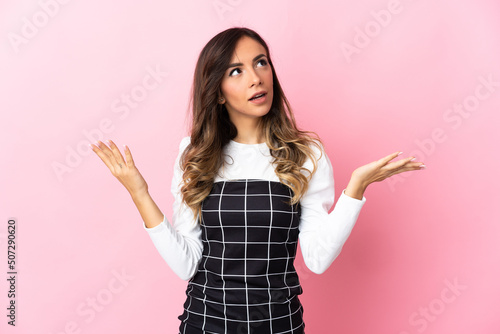 Young caucasian woman isolated on pink background stressed overwhelmed