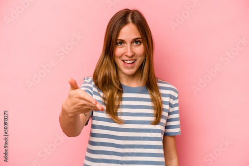 Young caucasian woman isolated on pink background stretching hand at camera in greeting gesture.