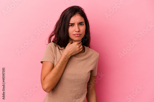 Young caucasian woman isolated on pink background suffers pain in throat due a virus or infection.