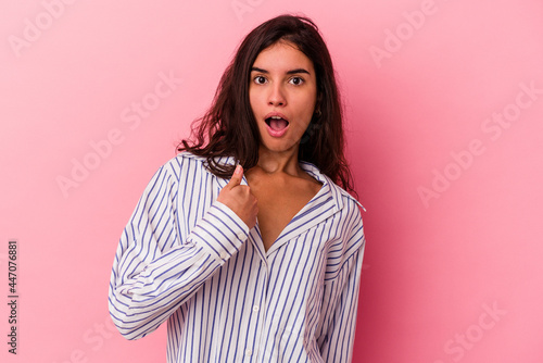 Young caucasian woman isolated on pink background surprised pointing with finger, smiling broadly.