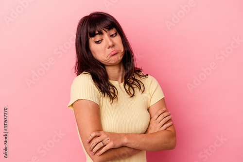 Young caucasian woman isolated on pink background tired of a repetitive task.