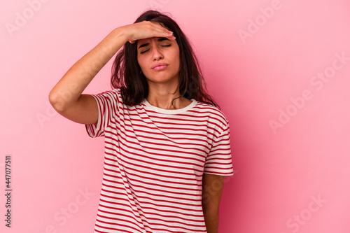 Young caucasian woman isolated on pink background touching temples and having headache.