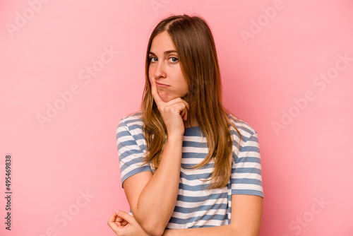 Young caucasian woman isolated on pink background unhappy looking in camera with sarcastic expression.