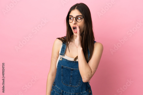 Young caucasian woman isolated on pink background whispering something with surprise gesture while looking to the side