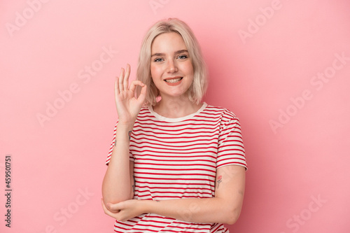 Young caucasian woman isolated on pink background winks an eye and holds an okay gesture with hand.