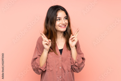 Young caucasian woman isolated on pink background with fingers crossing