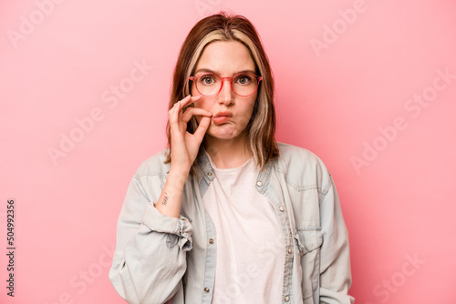 Young caucasian woman isolated on pink background with fingers on lips keeping a secret.