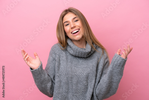 Young caucasian woman isolated on pink bakcground smiling a lot