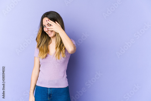 Young caucasian woman isolated on purple background blink at the camera through fingers, embarrassed covering face.